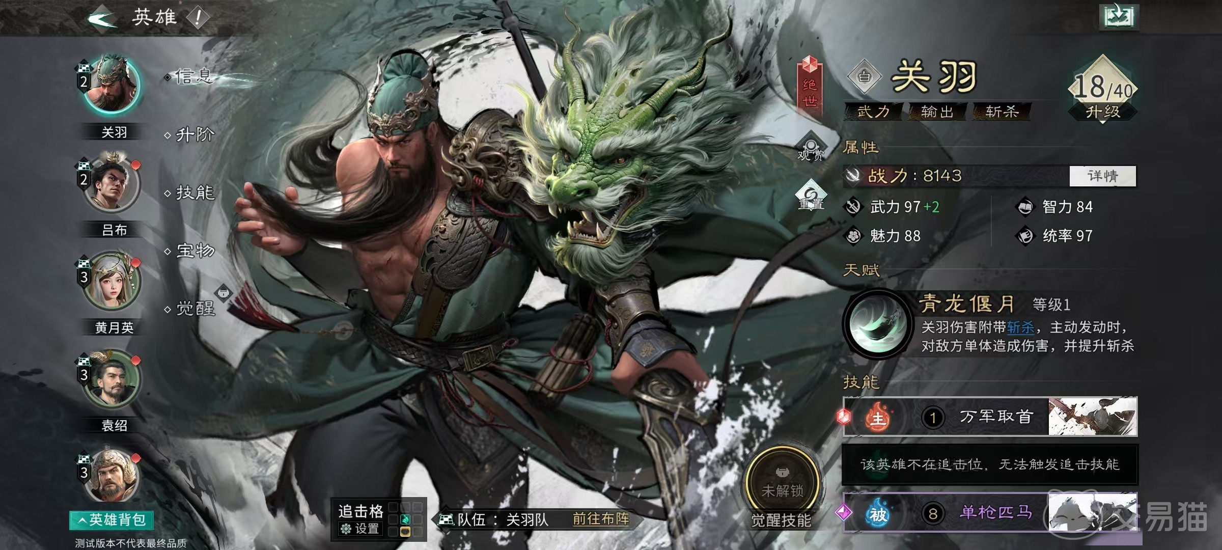 士兵配置上,前排选用藤甲兵承担承伤任务,保障核心输出单位生存空间;后排部署穿杨军,补足远程物理输出缺口,形成前后兼顾的火力覆盖体系。站位设计强调技能联动效率:貂蝉需精准占据关羽与郭嘉的追击格,触发二次追击机制;关羽则踩踏貂蝉追击格,实时获取其天赋提供的易伤加成与追击增益,从而构建起闭环式输出链路。