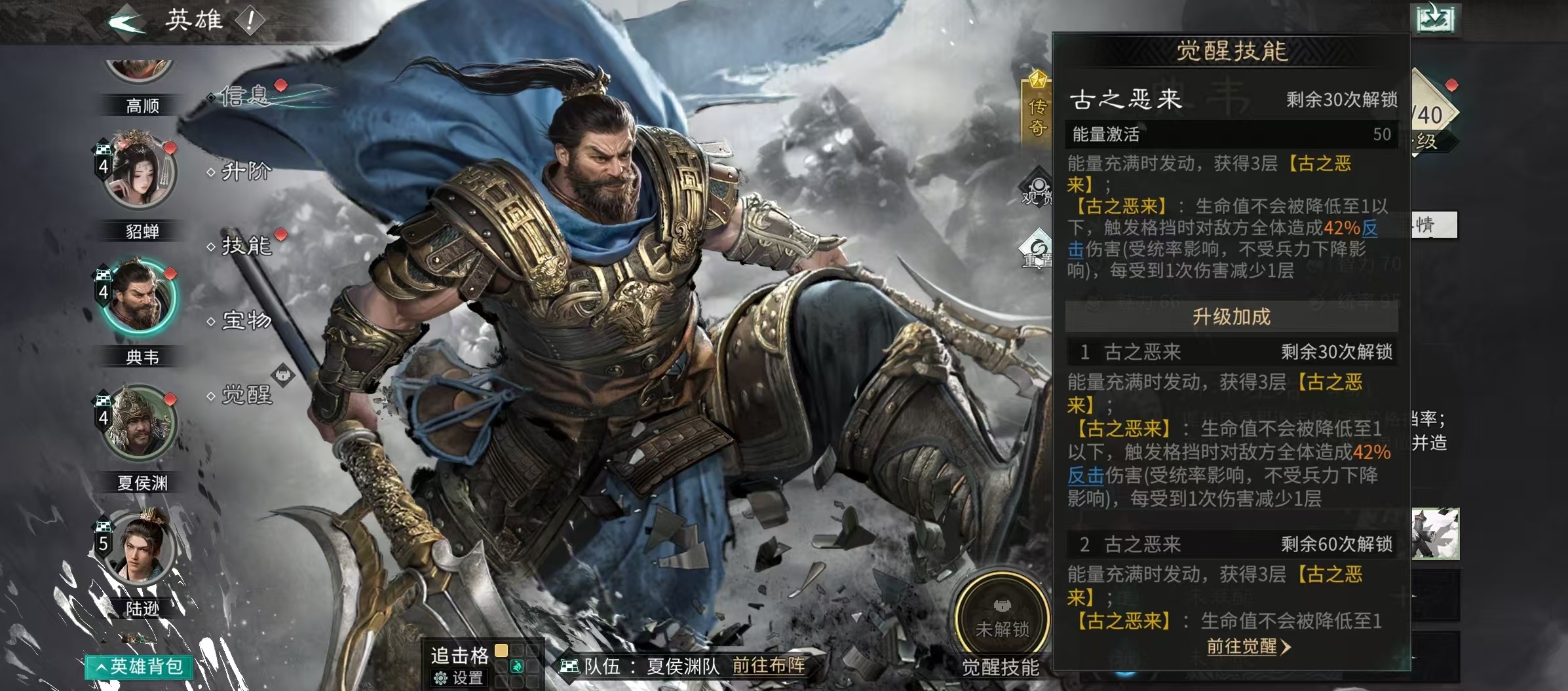 典韦的基础定位为统率型坦克,技能设计围绕“格挡—反击—反制”三层逻辑展开。其天赋【折冲左右】可使自身及相邻追击格单位获得12%格挡率;主动技能发动时,对两名随机敌方单位造成伤害并施加挑衅效果,强制其转向攻击典韦,从而有效分担队友承伤压力。当受到直接伤害时,典韦有概率触发反击,且格挡成功后可提升该次反击伤害。觉醒技【古之恶来】在能量满时自动激活,立即叠加三层“古之恶来”状态:处于该状态下,典韦生命值不会被削减至1以下;每次格挡均可对敌方全体发动反击伤害;每承受一次伤害则消耗一层状态。这一机制显著延长其持续作战时间,并在残局阶段形成可观的群体压制力。