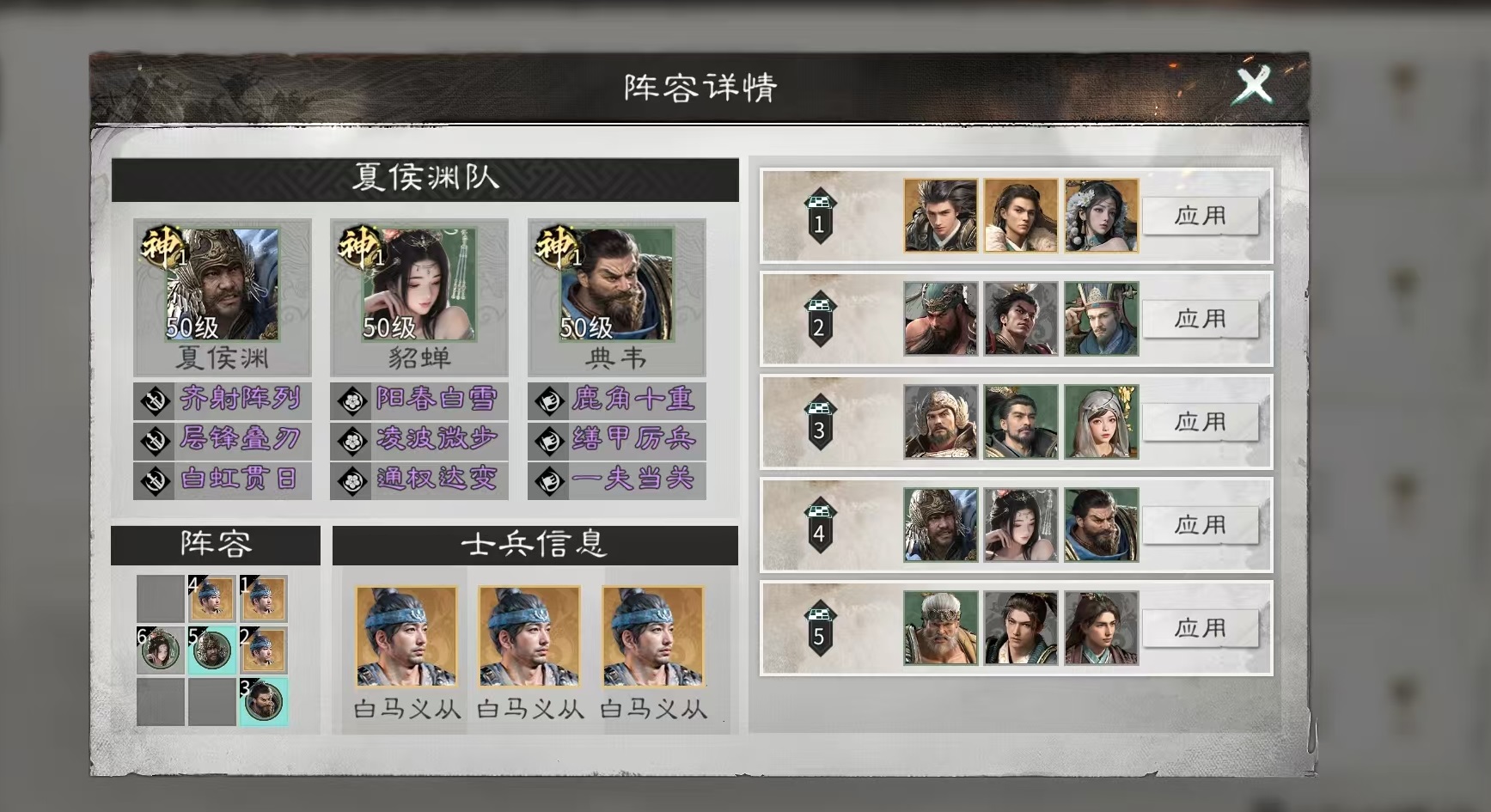 阵容构建上,推荐采用“典韦+夏侯渊+貂蝉”铁三角配置,兵种统一选用【白马义从】。布阵建议为:前排左、右位部署白马义从,中间由典韦镇守,承担主要承伤任务并触发反击输出;中排左侧放置白马义从,右侧配置夏侯渊,利用其追击天赋高频触发破甲伤害,形成稳定物理输出轴;后排安置貂蝉,发挥其辅助增益与控制衔接作用。整套体系兼顾坦度、爆发与功能衔接,适用于开荒推图、资源副本及高难度PVE挑战等多种场景。