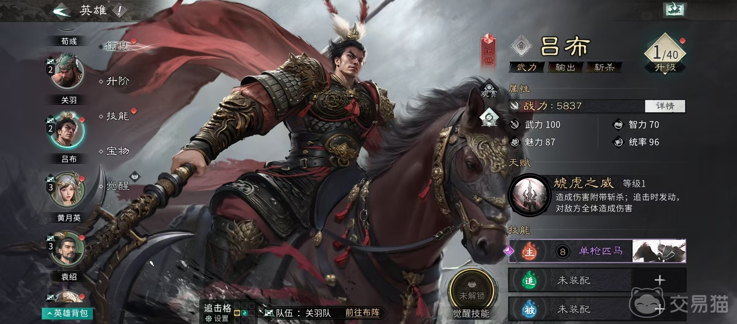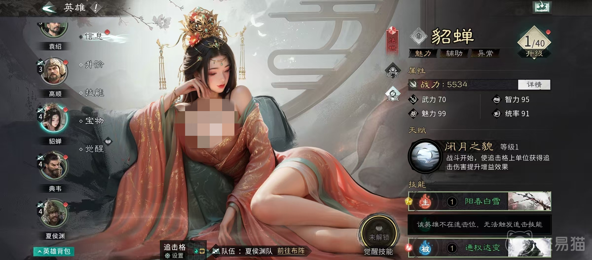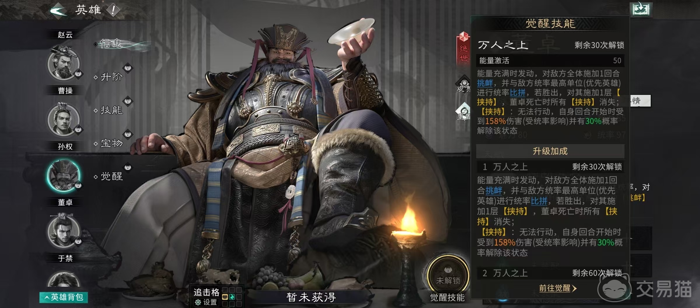 其觉醒技能则构建了董卓真正的战略支点:释放后对敌方全体施加一回合挑衅,并自动与敌方统率最高者进行单一对决。若董卓胜出(实际触发率极高),目标将被叠加“挟持”状态——无法执行任何行动,且在自身回合开始时承受高额固定伤害。得益于其本身统率成长优势及天赋持续掠夺敌方统率的能力,该对决几乎呈碾压态势,使“挟持”成为高稳定性的群体强控手段,极大压缩敌方战术空间。