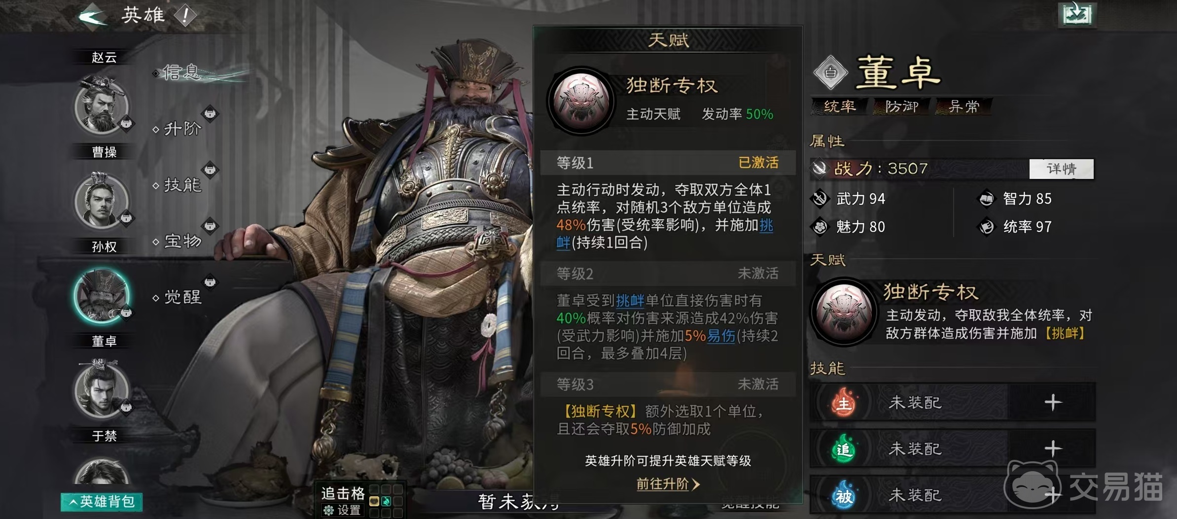 董卓拥有红色绝世品质,是全游少数具备四维均衡成长的统帅类角色:武力与统率基础值极高,智力与魅力亦处于同阶武将前列,使其在防御、控场、反伤及团队承伤调度等多个维度均具备不可替代性。其核心天赋【独断专行】具有三层战术价值:主动行动时,同步削减敌我双方全体1点统率(形成属性压制差),对三名随机敌方单位造成伤害,并强制其进入“挑衅”状态——即下一回合必须优先攻击董卓。该机制不仅强化了前排生存容错,更有效分流敌方输出,为后排创造稳定输出环境;同时,当董卓被处于挑衅状态的单位直接攻击时,有概率触发反击并施加“易伤”,进一步放大团队整体伤害效率。