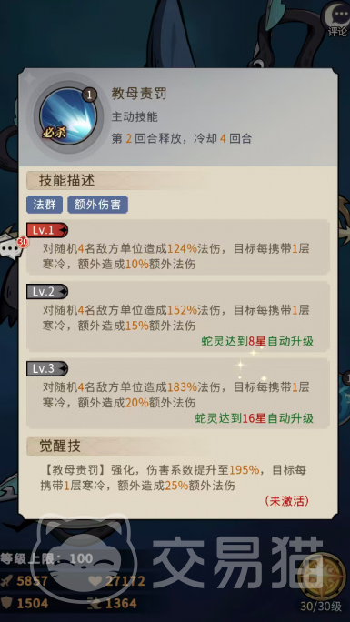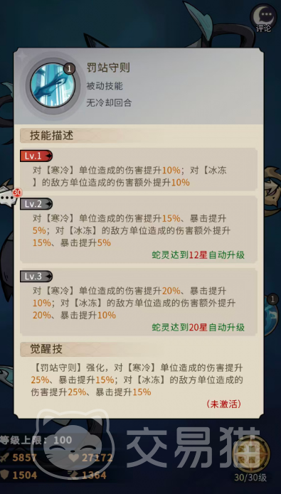 被动“罚站守则”构成其伤害闭环:对处于【寒冷】状态的目标,伤害提升10%;对处于【冰冻】状态的目标,额外再提升10%伤害。该被动强调技能释放顺序——必须先通过“仙灵术”或“教母责罚”挂上状态,再以此被动收尾,方可实现收益最大化。当蛇灵升至20星后,该被动进一步强化:对寒冷目标的伤害加成提升至20%,暴击率提升10%;对冰冻目标的伤害加成同样提升至20%,暴击率亦提升10%。