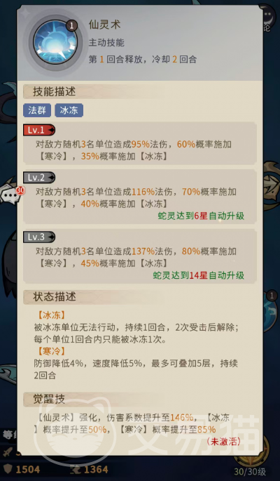 她的核心主动技能“仙灵术”具备稳定的群体法术伤害与状态施加能力:首回合释放可对敌方随机3名单位造成95%攻击力的法术伤害;同时附带60%概率施加【寒冷】状态,其中35%概率直接触发【冰冻】。当教母菲娅升至14星后,冰冻触发率提升至45%。需注意:【冰冻】会使目标在自身行动回合完全无法执行任何操作;该效果可持续至目标累计承受2次伤害后解除;且同一目标每回合仅可被冰冻1次。