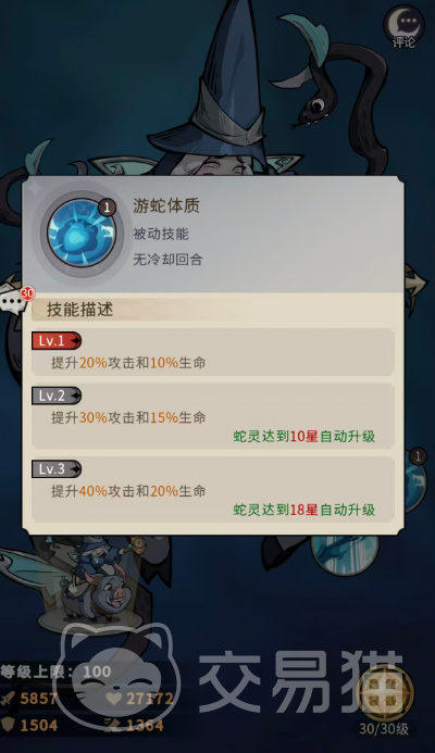 被动“游蛇体质”提供基础属性成长支撑:未培养时提升20%攻击与10%生命;升至18星后,该效果翻倍,即获得40%攻击与20%生命加成。此被动为教母菲娅构建生存与输出双维度基础的重要保障。