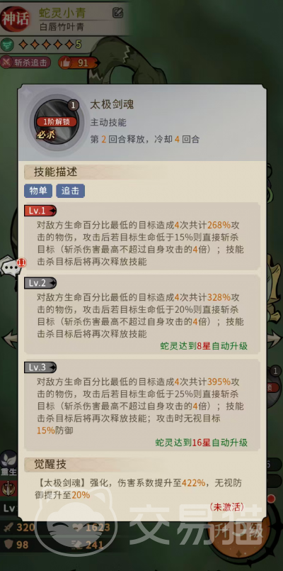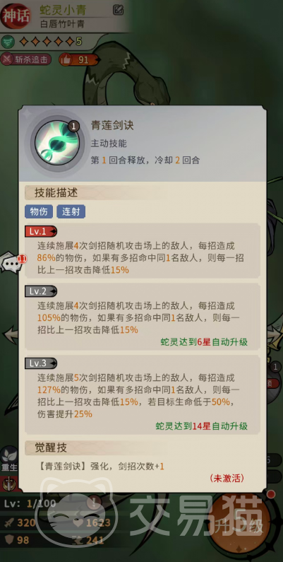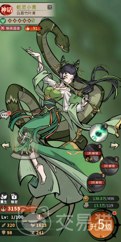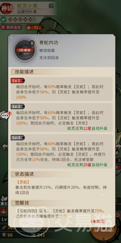 三技能为被动增益,基于竹叶青体质提供固定比例的生命值与攻击力加成,属常规属性强化。真正决定小青战场容错率的是四技能“青蛇内功”:每回合开始时,有60%概率激活“灵蛇”状态,获得暴击率+20%、伤害增幅+20%、闪避率+30%以及免疫控制效果延长1回合。当小青当前生命值低于50%时,该状态触发概率提升至100%,使其在中后期承伤压力增大时反而更稳定地发挥核心作用。