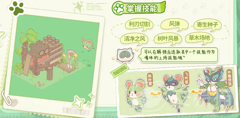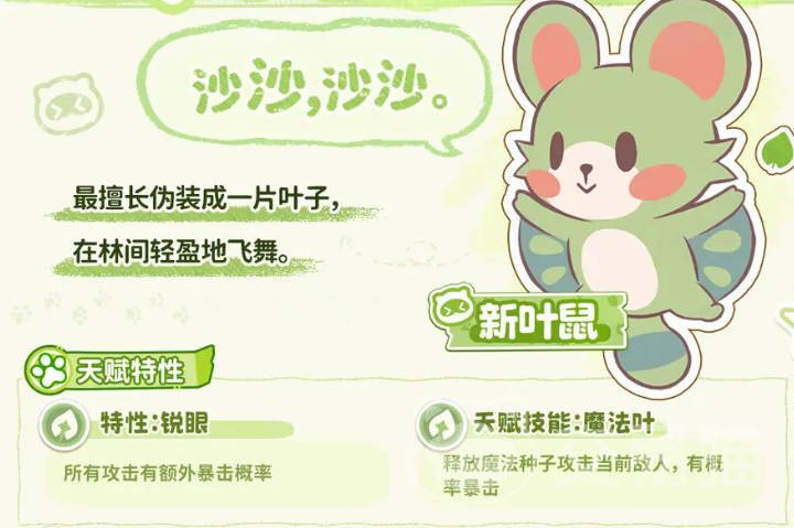 新叶鼠是风系体系中的暴击特化型角色。其特性“锐眼”直接提升所有攻击动作的暴击触发概率;天赋技能“魔法叶”在命中时额外播撒种子,不仅造成伤害,还会基于暴击率进一步放大输出倍率。二者叠加使整体暴击覆盖率远超常规风系单位。后期可习得利刃切割、风弹射击、寄生种子及树叶风暴等技能,兼顾单体穿透与群体压制。进化路径为新叶鼠→飞叶鼠→隐身侠鼠,隐身侠鼠阶段新增隐匿突袭机制与风元素穿透强化,成为高难度副本中的关键收割角色。