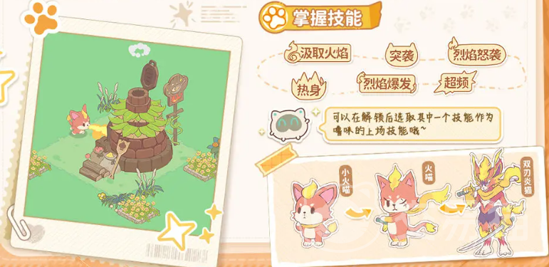 小火喵作为火系入门首选,拥有双重机制支撑:其特性“烈焰疾行”可在攻击时叠加燃烧伤害,并同步提升自身移速,实现输出与机动性并重;天赋技能“小火苗”则持续施加范围灼烧效果,配合突袭类动作可高效触发额外伤害。后续进化链为小火喵→火喵→双刃炎猫,其中双刃炎猫解锁“烈焰怒袭”,大幅提升单体爆发频率与瞬时输出能力。