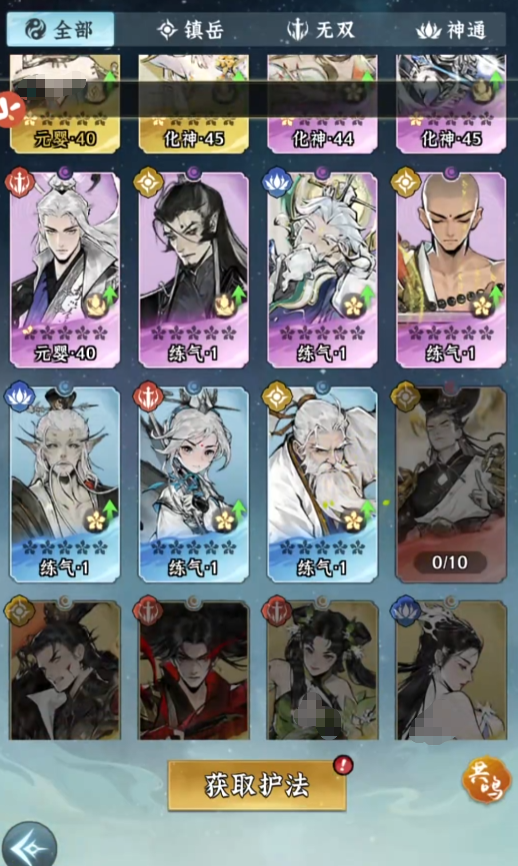 除完整角色外,单次抽取还可能获得角色碎片、护法单位及修为材料。其中,修为是提升角色等级的核心养成资源;护法则具备双重价值——集齐指定数量可激活成就奖励,亦可用于已有角色的破境突破,从而解锁更高阶属性与悟道、证道能力。