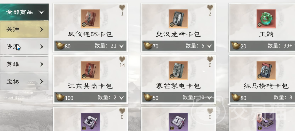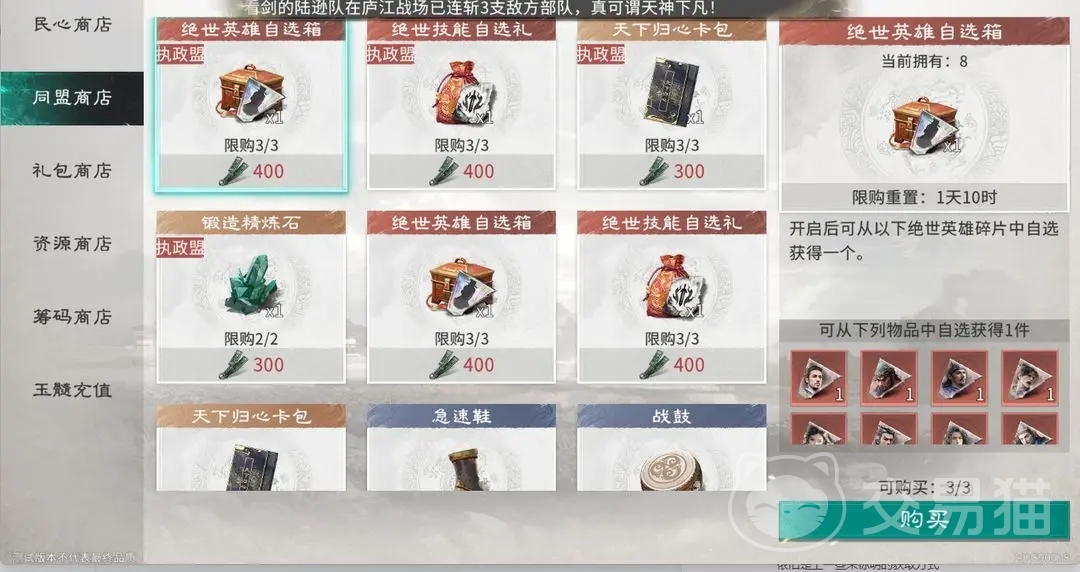 玉髓商店与民心商店聚焦于英雄本体获取,支持按阵营筛选补缺。例如,若当前缺少魏国核心武将或尚未解锁蜀国高星角色,可优先在此类商店中购置对应阵营礼包。此外,当某位武将已升至高星级后,还可直接购买其专属技能卡包,实现战力快速补强。