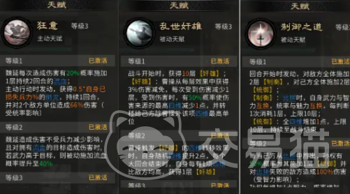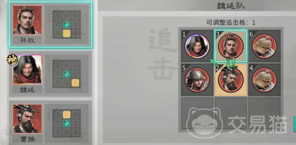 阵容布阵采用前二后一结构:前排固定部署两名藤甲兵,承担物理抗性与承伤职能;后排单列杨军,专注补足单点穿透输出。站位设计强调追击联动——曹操需同时位于魏延与孙权的追击格内,而魏延自身无需占据追击格。三名核心武将均需完成升阶操作,方可激活追击格功能。魏延天赋“狂意”为输出基石,1级即生效,主动行动时可锁定两名敌方目标,造成66%武力伤害;曹操天赋“乱世奸雄”提供开局10层护盾,总计减免30%所受伤害;孙权天赋则于战斗首回合同步施加两层“制衡”(作用于敌方)与两层“统御”(作用于己方)。