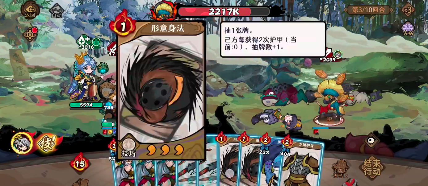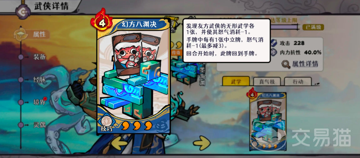 第二维度是其悬浮机制带来的团队生存保障能力。该技能具备直接复活己方单位的效果,且每场战斗最多触发2次复活;每次复活同步为全体友方单位恢复满额生命值。在无技巧卡可用时,可启用专属卡“幻方八渊决”:使用后为所有友方武侠各发现1张无形武学,并使这些武学的怒气消耗降低1点;此外,手牌中每有1张中立牌,该减耗效果额外叠加1层,最高可达3层。值得注意的是,此卡于回合开始时自动返回手牌,确保高频复用。