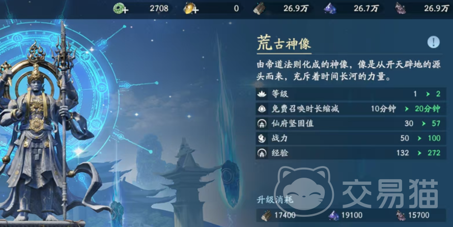 召唤入口并非直接置于主界面,而是嵌套于“荒古神庙”场景内,需随主线进程逐步解锁。完成对应章节任务后,荒古神像区域将正式开放。进入该场景后,界面显示“召唤”与“升级”两大功能模块——二者并非孤立存在,而是形成资源协同闭环。其中,“升级”虽不改变召唤基础概率,但直接影响免费召唤频率:荒古神将等级由1级提升至2级后,免费召唤冷却时间从20分钟缩短为10分钟;同时,仙府坚固值与经验获取量同步提升。这意味着,高等级神将可显著增加长期免费抽卡次数,积少成多,大幅降低道具消耗压力。