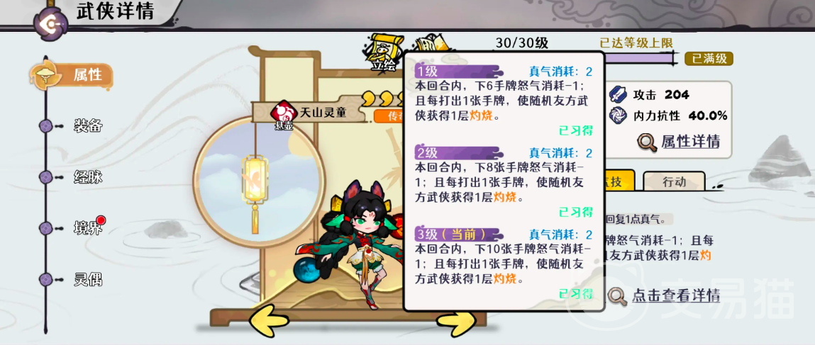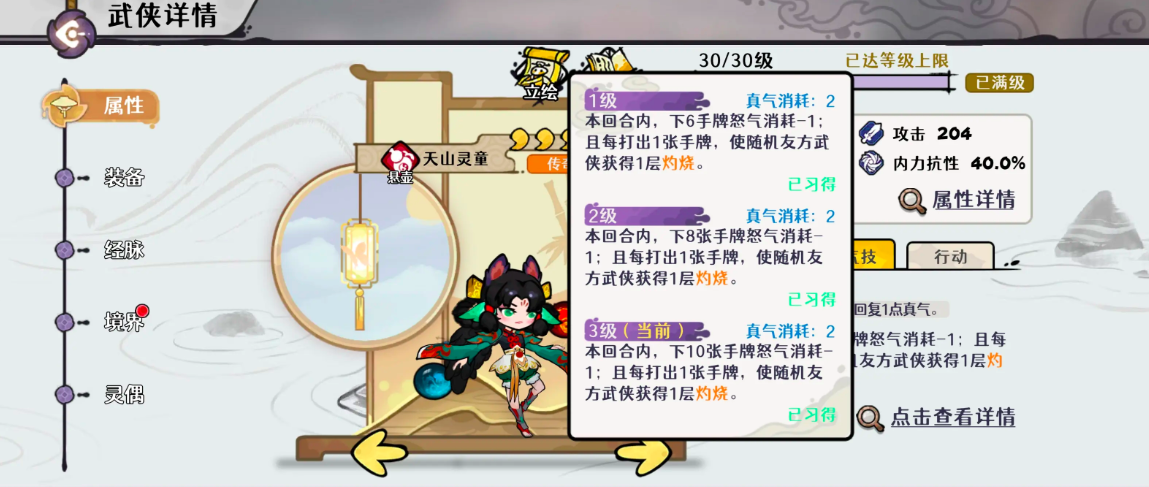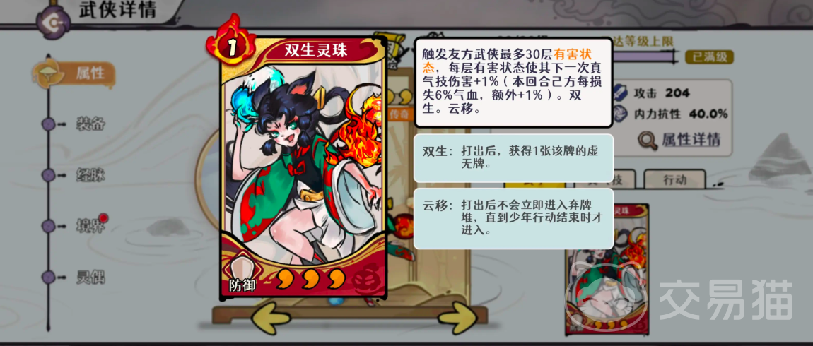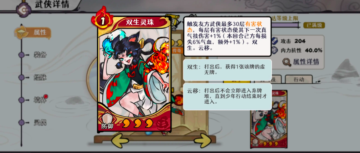 要发挥天山灵童的最大价值,必须深入理解其属性与技能联动逻辑。其核心输出循环围绕“灼烧”与“真气”双资源体系构建。首推武学卡牌【双生灵珠】,该技能效果与己方单位所受灼烧层数及当前气血比例强相关:当灼烧叠至5层且角色气血降至约50%时,可稳定触发约50层真气增伤,是自残流成型的关键支点。