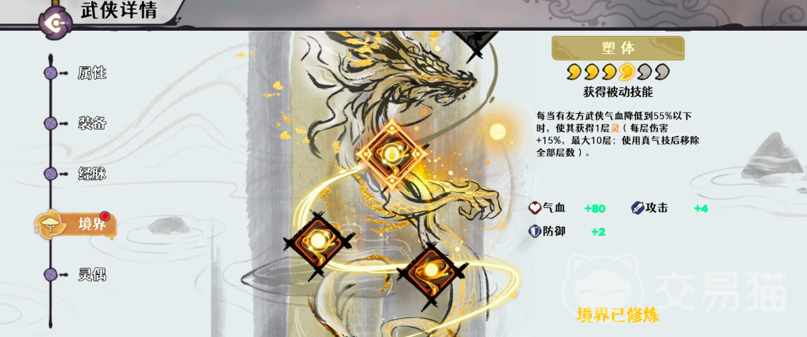 被动技能【塑魂体】提供动态伤害加成:每当有友方武侠气血低于55%,即为其赋予1层“灵”,每层提升15%伤害,上限10层;使用真气类技能后,所有“灵”层数清空。这一机制支持两种主流打法——轻压试探型(低层数持续压制)与蓄力爆发型(叠满10层后集中释放),策略弹性极高。