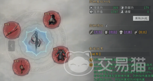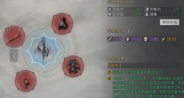 从属性构成来看,龙泉宝剑具备扎实的基础数值:防御+179、生命+1787、攻击+369。虽无速度加成,但其附加特效极具实战意义,涵盖稳固、抗爆与斩杀三类核心机制。当与破军套装搭配时,可进一步激活套装效果——两件套提供5%伤害加成;四件套则强化天赋技能与觉醒技能的直接伤害,额外附加30%伤害;若目标当前生命值低于30%,该附加伤害再提升10%;对群体目标释放技能时,附加伤害比例为40%。