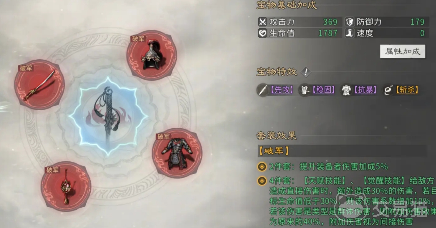 各宝物套装具备差异化定位:有的侧重爆发伤害,有的强化生存韧性,有的专注辅助增益。玩家应依据武将职能进行定向选择——例如高攻击型武将优先搭配输出向套装,治疗或控制类武将则更适合选择提升队伍整体续航与抗压能力的套装。此外,不同部位宝物拥有固定主属性方向与可变副特效:武器类主攻进攻属性,推荐关注“神威”“追袭”等特效;头盔以防御向为主,“金钟”“精甲”可显著提升承伤能力;铠甲类常见特效为“重生”“复活”,利于延长关键武将战场存活时间;饰品则倾向功能性输出延伸,“收割”“斩杀”适用于收割残血与扩大战果场景。