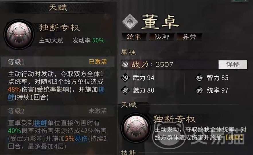 董卓的核心天赋具备双重战略意义:主动行动时,可同步夺取敌我双方统帅值,并对三名随机敌方单位施加伤害与挑衅效果。这一机制使其天然承担团队承伤枢纽职能,有效分担主C压力。当天赋升至二阶后,新增反击机制——被挑衅目标攻击董卓时,有概率触发反伤并附加易伤状态,显著提升队伍整体输出效率。因此,在布阵实践中,董卓通常部署于前排中央或侧翼,重点确保其追击格覆盖主输出武将,自身无需刻意占据他人追击位,操作容错率高,部署灵活度突出。