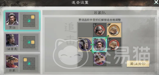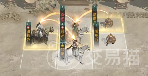 站位设计严格遵循“追击格联动”原则——吕蒙不占用追击格,诸葛亮置于其追击格内,确保每次追击均能高效触发。兵种部署强调功能分区:贾诩上方配置连弩军,强化远程压制与爆发输出;前排两侧分别布设藤甲兵,利用其高护甲属性承担主要承伤任务,为后排双核心(诸葛亮+贾诩)争取安全输出空间。技能搭配上,诸葛亮主带“通权答辩”(群体伤害+控制)、“运筹决胜”(强化控场覆盖率)与“兵不厌诈”(提升连锁控制强度),三者协同显著放大体系压制力。