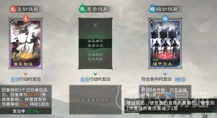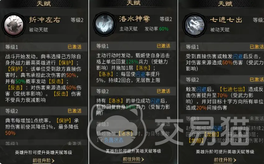 典韦是整套反击体系的防御基石。其主动技能“首尾相连”可随机为三名队友恢复55.8%兵力,并降低全体9%受击伤害,有效维系全队血线稳定性;叠加“折冲左右”天赋,不仅实现对赵云的硬性保护,更将反击触发权统合至前排,大幅强化反击链的响应密度与伤害转化效率。实战数据表明,该阵容对单核追击流具备显著压制优势,尤其在对抗依赖单一高爆发武将的队伍时表现突出。