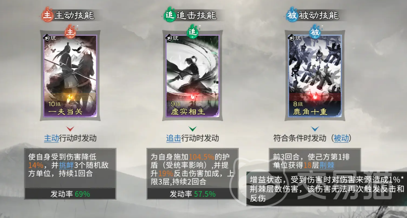 技能组合需严守功能分工:赵云定位为反击输出中枢,主动技能选用“一夫当关”,可降低自身14%所受伤害,并挑衅三名随机敌方单位,强制吸引火力以高频触发被动反击;追击技能配置“虚实相生”,提供护盾的同时提升反击伤害及天赋加成,与“折冲左右”形成双重增益闭环;其被动技能赋予前排单位受击时释放荆棘伤害的能力,该伤害不可被敌方反击反制,配合赵云自身反击频率,可高效压制敌方主C单位生存空间。甄姬担任续航与辅助支点,主动技能“凌波微步”定向为赵云恢复58%兵力,并附带闪身位移效果,显著提升前排持续作战能力。