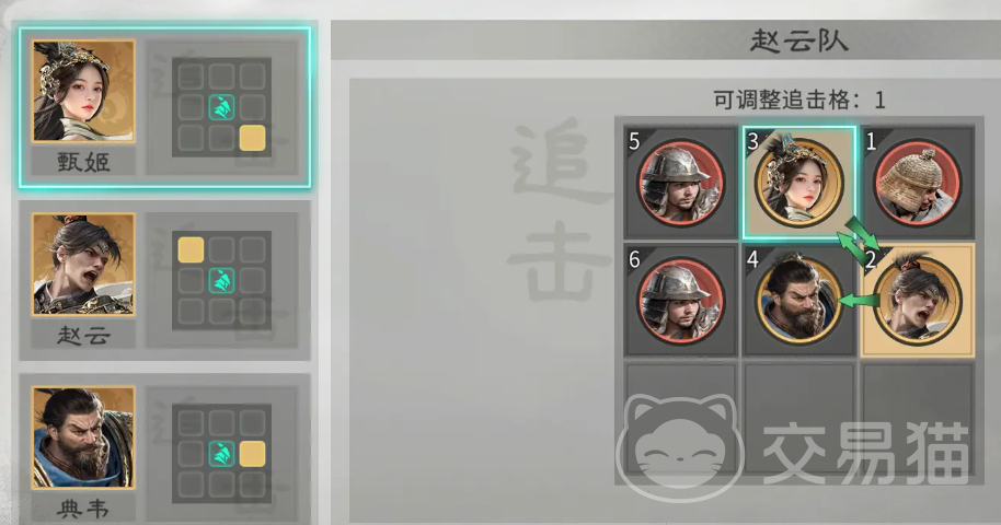 阵容由典韦、甄姬、赵云构成主体框架,兵种配置与阵型布局直接影响实战效果。后排双穿杨军承担补充输出职责;藤甲兵前置部署于甄姬前方,用于吸收前排集火伤害。英雄站位方面,赵云需严格置于典韦与甄姬之间,确保其处于典韦追击技能的有效触发范围内;典韦作为前排核心,依靠自带天赋“折冲左右”,既可分担赵云所受50%直接伤害,又能联动激活全队反击响应;甄姬则需调整至赵云追击格右上位置,使其始终处于赵云技能覆盖区内,从而稳定触发追击协同效果。