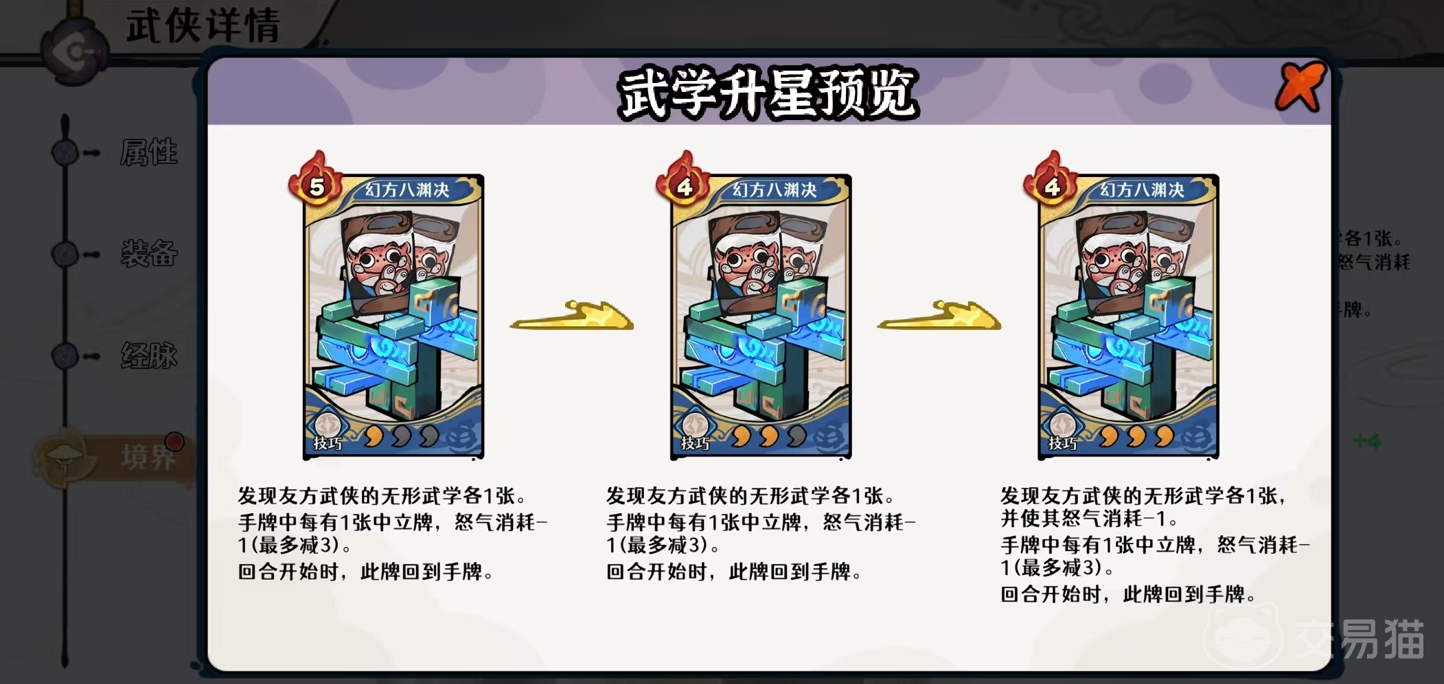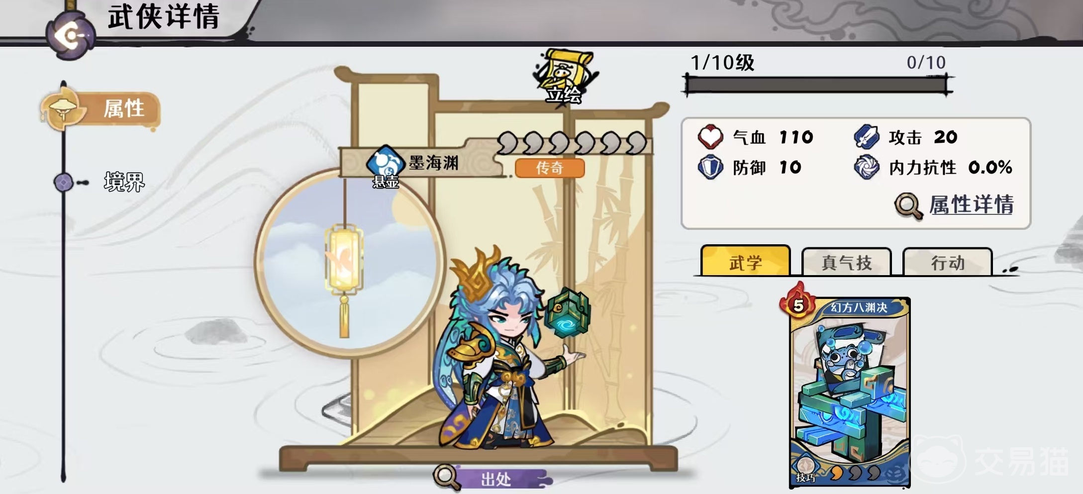 墨海渊定位为水系技巧流关键启动者,兼具治疗、增益、手牌调度与核心保护能力。其武学「幻方八渊决」可为友方武侠发现一张无形武学牌;若手牌中存在中立牌,该技能怒气消耗最多降低3点(每张中立牌减1点);且该牌于回合开始时自动返回手牌。真气技能在行动开始时恢复1点真气,并允许免消耗打出两张怒气需求>1的少年技巧牌;若实际打出数量不足,则额外尝试从卡组中发现两张无形的少年技巧牌;战斗开始时真气自动回满。二命后机制发生质变,整体循环稳定性与战术容错率大幅提升,在开荒推图与高难幻境副本中均表现优异。