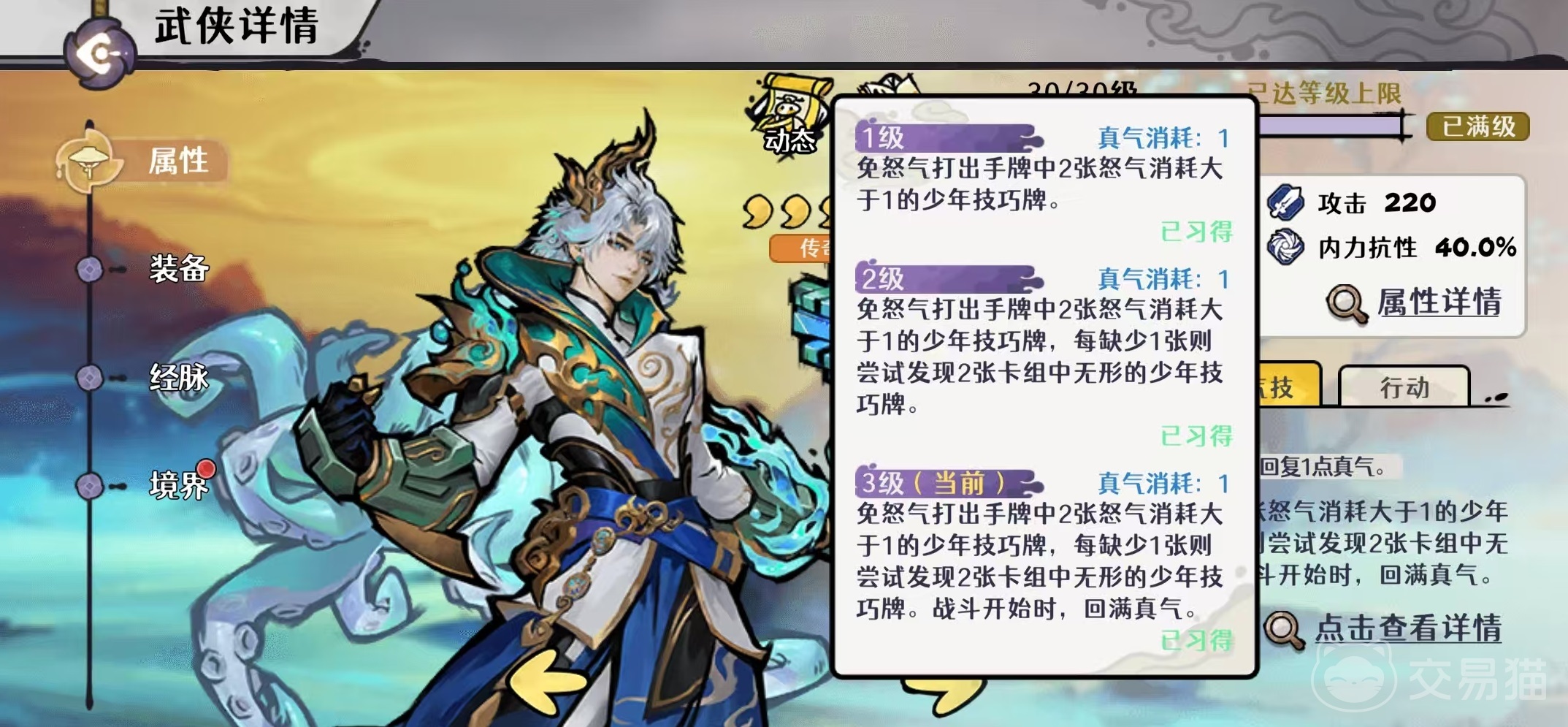 养成路径清晰明确:零命即可开启经脉并使用悬壶功能,具备基础可用性,但因真气技消耗为2,手牌循环略显吃力;二命后真气技消耗降至1,实现每回合稳定释放,成为必练核心;四命进一步强化技巧流运转效率,触发技巧牌额外回怒效果,显著提升爆发节奏与续航强度。若主玩飞刀流或叠甲流体系,建议至少抽取至二命阶段。