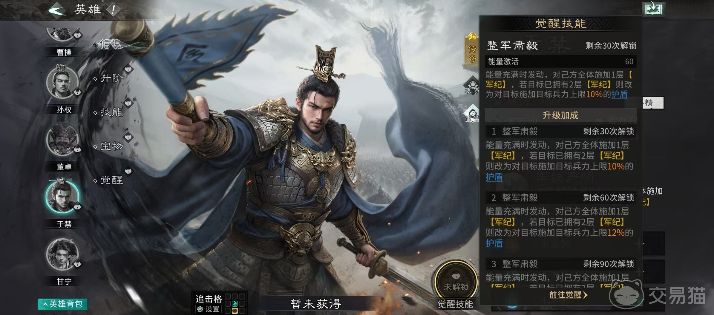 该机制使于禁在战局中同时承担减伤增益与应急治疗职能,功能维度丰富,契合持久战与消耗战节奏。其觉醒技能在能量满格后释放,可对敌方全体附加一层军纪;若目标已拥有两层军纪,则自动转化为护盾效果,进一步强化反制能力与容错空间。