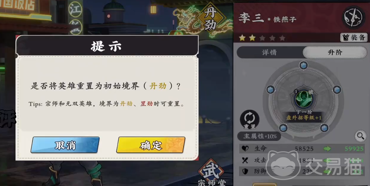 若培养路径调整,支持角色重置功能。但重置仅限于“丹劲”与“罡劲”两个基础境界,更高境界无法回退。重置后可返还部分升阶材料,便于资源再分配。该功能仅对橙色品质侠客开放,故不建议将核心资源投入紫卡及以下品质角色的升阶培养中。此外,角色等级提升与升阶需同步进行,二者共同驱动属性成长。