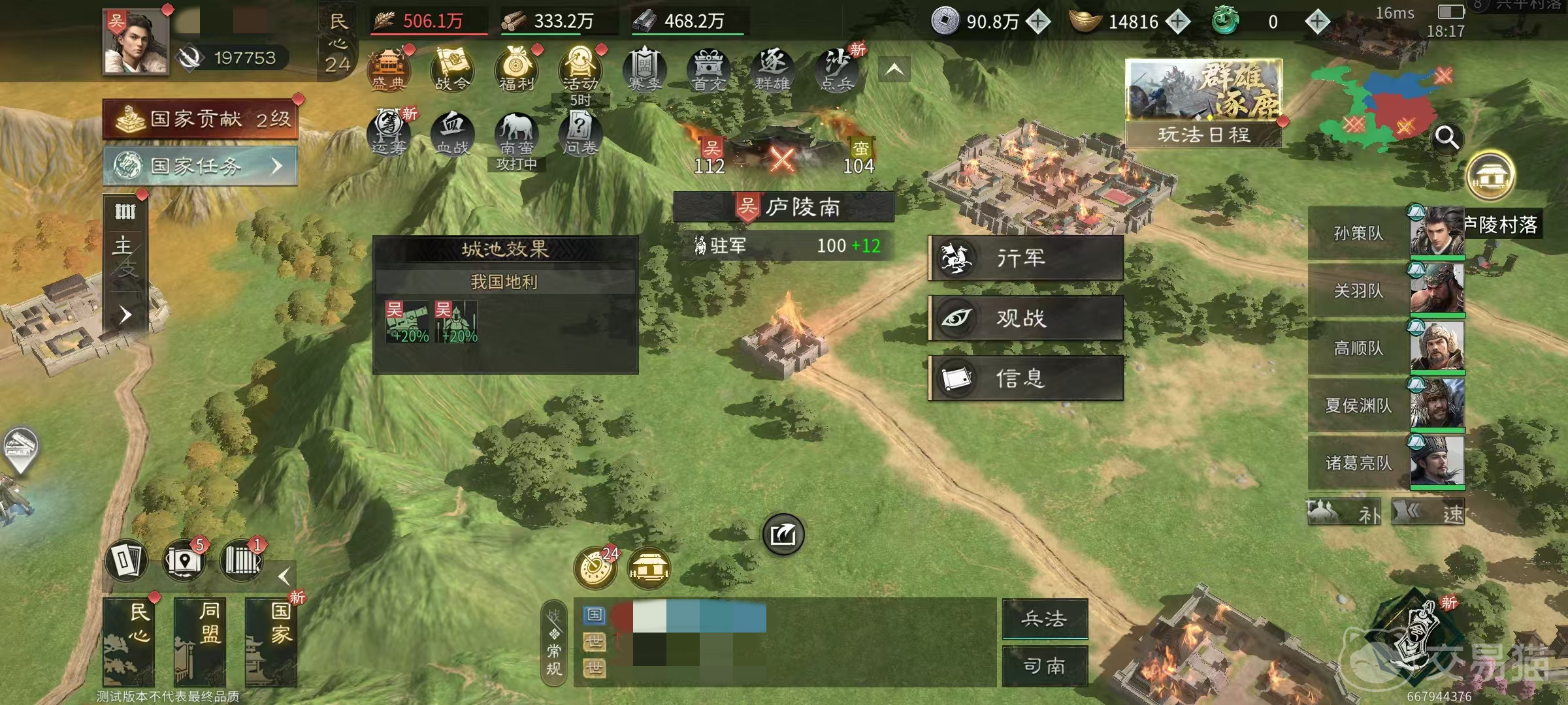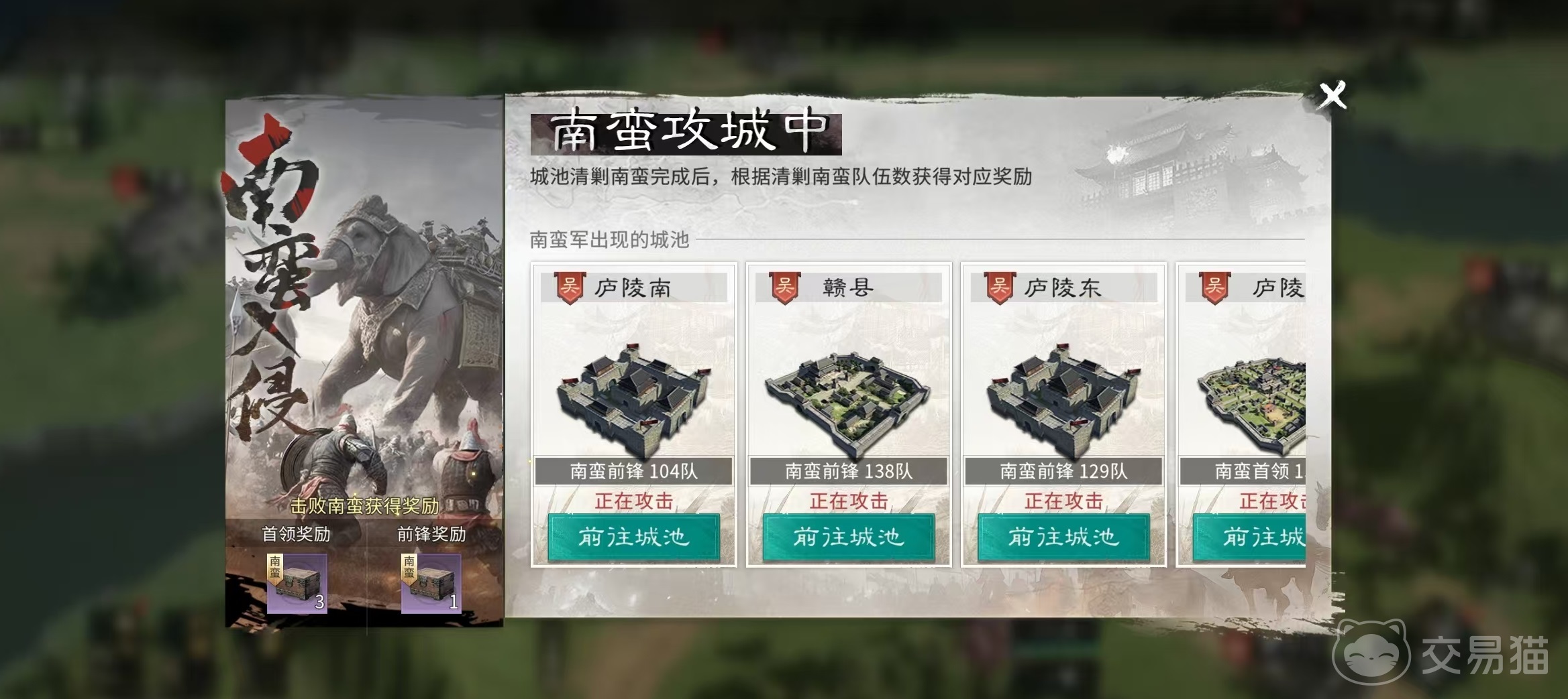 该活动不涉及跨服交互,全程在本服地图内展开。每日共开放三轮,具体时间为:12:30至14:59、17:30至19:59、21:30至23:59。玩家可在活动开启时段内,通过主界面右下角活动入口或世界地图直接点击进入。活动界面实时展示当前被南蛮势力占据的城池位置,支持按距离排序筛选,便于快速定位最近目标。所有可攻打城池分为两类——前锋据点与首领驻地,二者均提供独立奖励,且击败次数计入总战功统计。