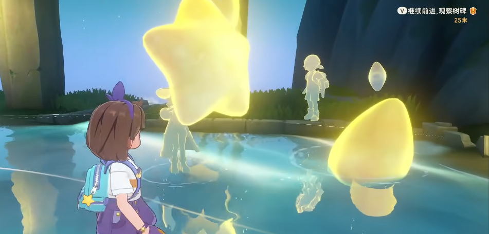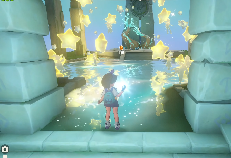 第一处高感知彩蛋位于一处废墟遗迹内部。当玩家步入该区域,地面呈现镜面湖面效果,上方悬浮点状星光,行走其上可清晰映出多重倒影。这些倒影并非随机生成,而是精准复刻页游时期关键角色形象——其中乐维的形象尤为突出,同时融入《洛克王国》系列大电影的经典镜头片段。这一视觉设计配合原汁原味的页游BGM,辅以乐维精灵的语音旁白,形成强烈的时空回溯体验。值得注意的是,该彩蛋为一次性触发机制,建议玩家在首次抵达时驻足记录。