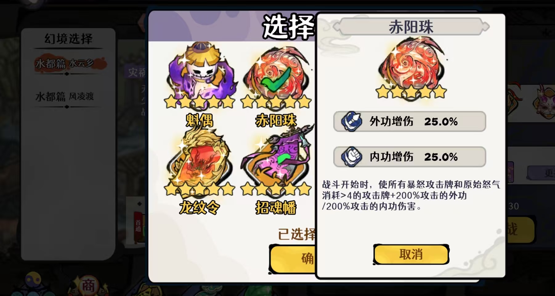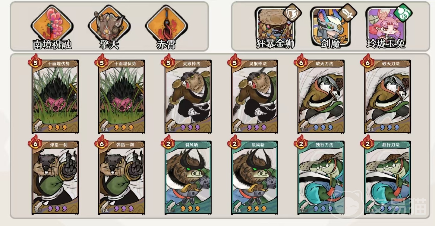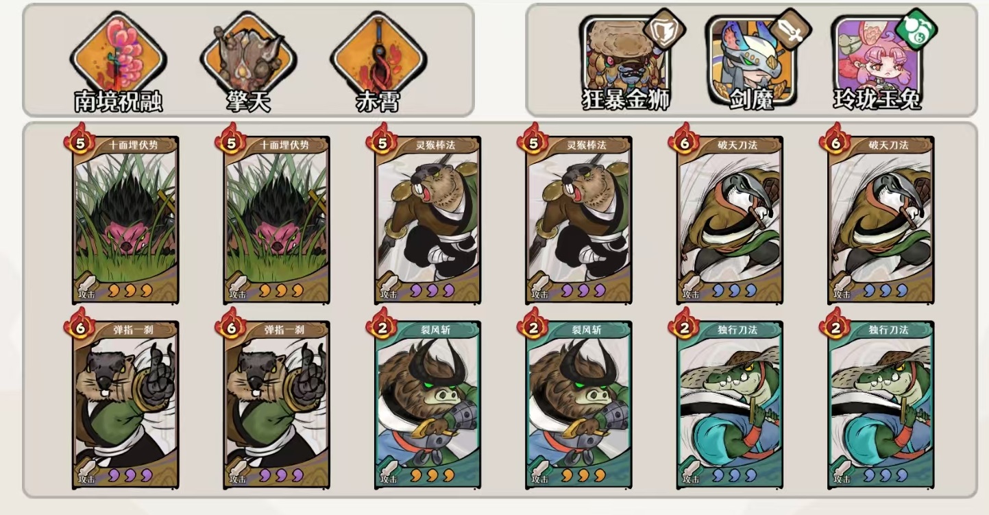 狮子定位为功能性副C兼护甲提供者,装备组合为饮血四件套+踏风逐云,后者专用于为少年角色叠加护甲,神话效果建议贴近200%;前缀选取以铁衣为最高优先级,其次为养元。武学配置方面,土系共八张:十面埋伏×2、灵猴棍法×2、破天刀法×2、弹指一刹×2;风系共四张:烈风斩×2、独行刀法×2。古器选用赤阳珠、沧澜链、魍面,三者均直接强化少年攻击力,不可替换。