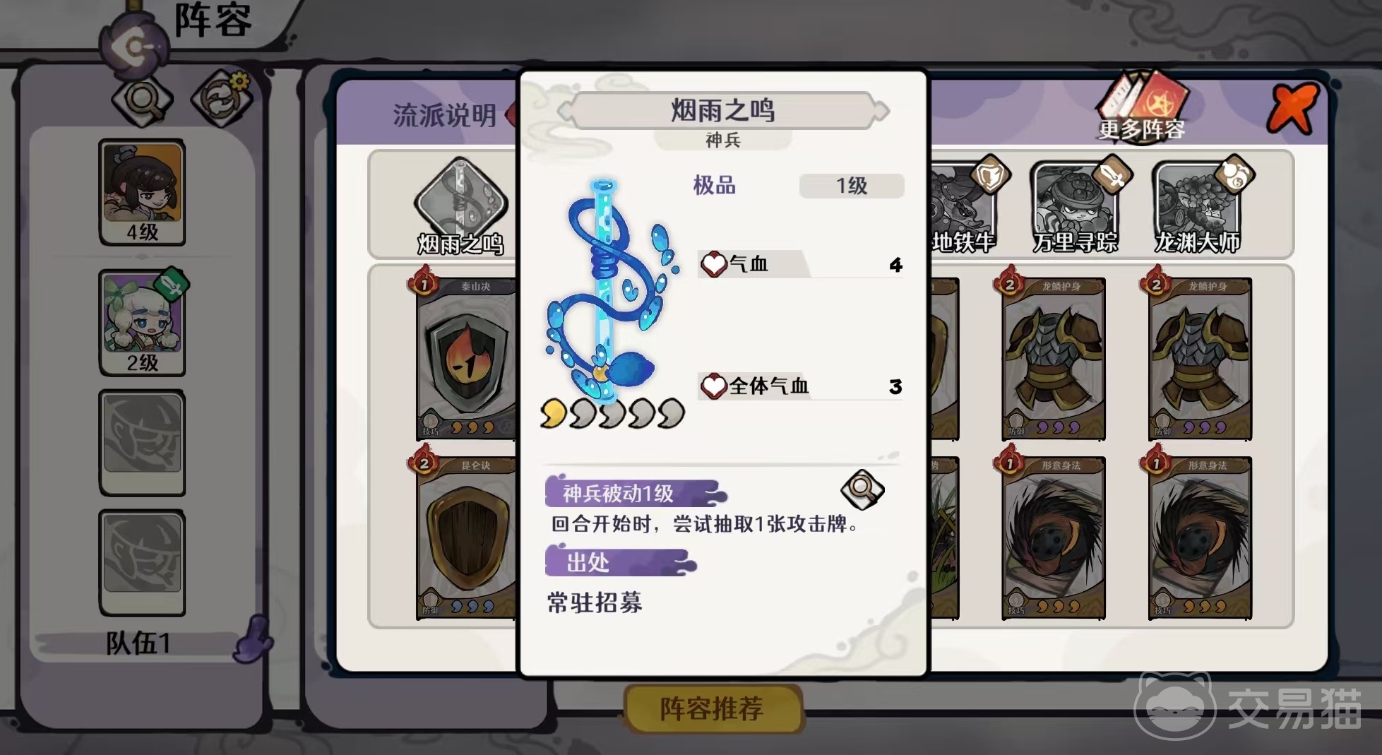 万里寻踪是整套体系的输出核心,其武学“寻踪宝铲”具备双重特性:对全体敌人造成外功伤害,并强制移除我方所有角色当前护甲;每移除一名友方单位的护甲,额外追加一段攻击;该卡为循环类型,打出后不进入弃牌堆,而是直接置于牌库顶部,确保关键牌可持续调用。其真气技能可削减自身武学怒气消耗2点,显著提升技能释放频率。龙渊大师定位为续航与调控中枢,武学“龙渊心法”可恢复1点怒气,且本回合每打出一张防御牌,额外恢复1点怒气,上限为3点;真气技能则对随机敌方造成内功伤害,同时治疗我方血量最低单位。在神兵配置上,推荐烟雨之鸣(回合开始时尝试抽取1张攻击牌)、燃火咏叹(每打出3张牌,恢复1点怒气)与万里破军(当我方失去全部护甲时,立即获得100%防御的护甲),三者分别强化起手节奏、怒气续航与破甲瞬间的生存保障。
