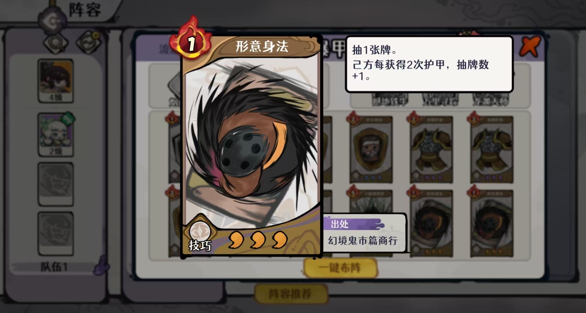 卡组构建方面,需围绕“护甲生成—怒气转化—破甲触发”三阶段精准选牌。核心功能卡包括:护元神功(为目标赋予护甲并抽1张牌)、龙鳞护身(赋予护甲并叠加1层冷血,提升暴击率)、昆仑决(赋予护甲并获得1层防御)、真气护体(赋予护甲,若目标真气已满,则护甲值提升)、形意身法(抽1张牌;我方每累计获得2次护甲,本卡抽牌数+1)。上述卡牌共同构成护甲覆盖率、资源滚雪球效率与节奏控制力的三重保障。