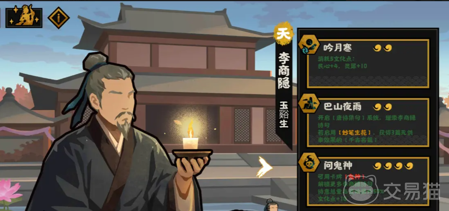 综上所述,李商隐在《无悔华夏》中兼具文化输出、战术干扰与资源生成三重功能。他不仅能稳定提供高价值【鬼神】卡牌,还可通过多项技能联动提升民心、灵犀、诗意等关键属性,是晚唐剧本中兼顾战略纵深与文化发展的核心名臣。敬请关注1月9日正式上线,及时招募,开启全新历史演绎。