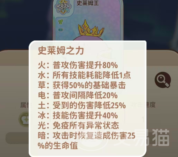基础资质为87点,表面看略逊于主流神兽,外观亦偏萌系,易被误判为功能性辅助。实则它是游戏中唯一定位为“王系”的史莱姆谱系顶端个体,机制上具备天然抗性优势:不被任何属性克制,亦无固定天敌属性,形成稳定的对抗容错空间。核心竞争力源于专属被动——当队伍中存在其他史莱姆时,该被动即时激活;若携带火属性史莱姆,史莱姆王的普通攻击伤害将提升80%,增幅效果直接、稳定、可叠加。