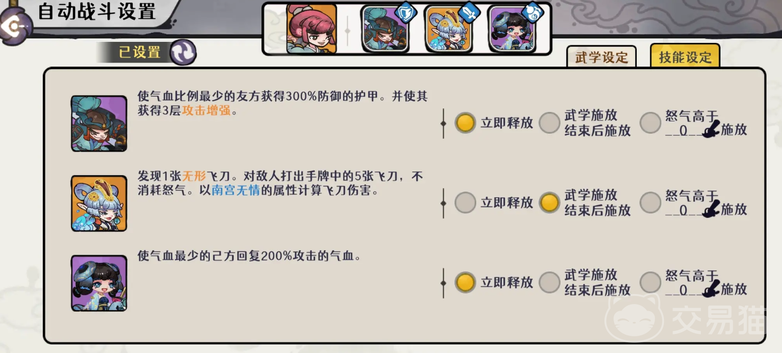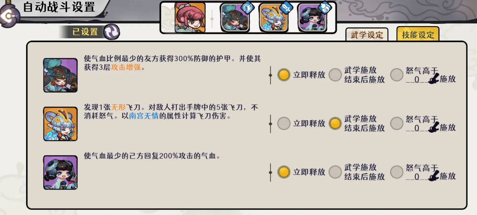 首推「飞刀速攻流」,主打开局即爆发、怒气无缝衔接的高频率输出节奏。该流派以南宫无情为核心输出,依赖其飞刀类武学触发连击效果;银枪公子承担关键的怒气供给与前排承伤职能,其技能可为全队提供300%防御加成,并同步恢复我方能量;水木灵儿则作为治疗支点,单次气血恢复量达200%,且具备攻击回血机制,保障续航稳定性。三者协同下,首回合即可完成怒气铺垫并启动飞刀循环。神兵配置推荐擎天、祝融、赤霄,三者分别强化暴击率、怒气获取效率及技能倍率,与角色机制高度契合。武学搭配建议优先选用具备飞刀标签的卡牌,配合银枪公子与水木灵儿的主动技,实现飞刀技能的自动高效释放;南宫无情的技能释放顺序可设为“武学释放完毕后立即使用”,确保怒气满额时打出全额伤害,最大化节奏密度。