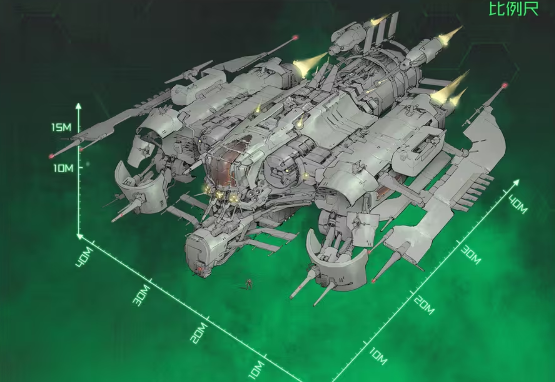 舰体采用三段式功能分区:中央区域集中布置舰桥、主弹药库及通用货仓,保障火力投送链路最短化;两侧舱段内置高密度燃料储备与等离子储能单元,支撑长时间饱和打击;背部弹药输送通道采用凝金鳞甲覆盖式设计,既强化顶部防御,又确保重型武器系统的稳定供弹节奏。