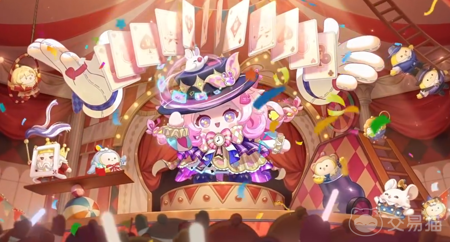 本季主打三位原创角色:大魔术师梨嘉、马戏乐手咻咻与魔术助手KK。其中,梨嘉作为马戏团核心人物,整体造型融合经典舞台魔术元素,身着紫调长袍,头戴黑色高顶礼帽;悬浮于帽周的扑克牌与偶现的小白兔,共同构建出充满悬念的视觉语言,呼应其“奇迹缔造者”的身份设定。