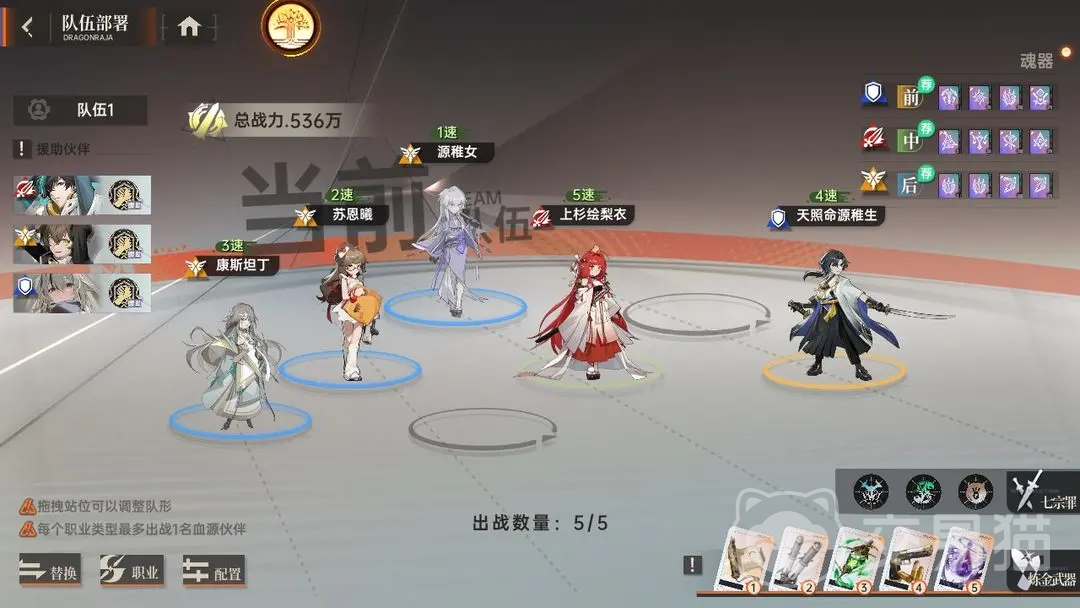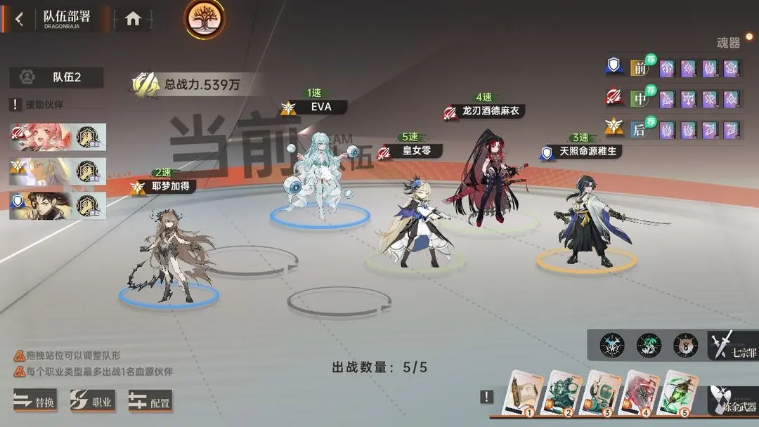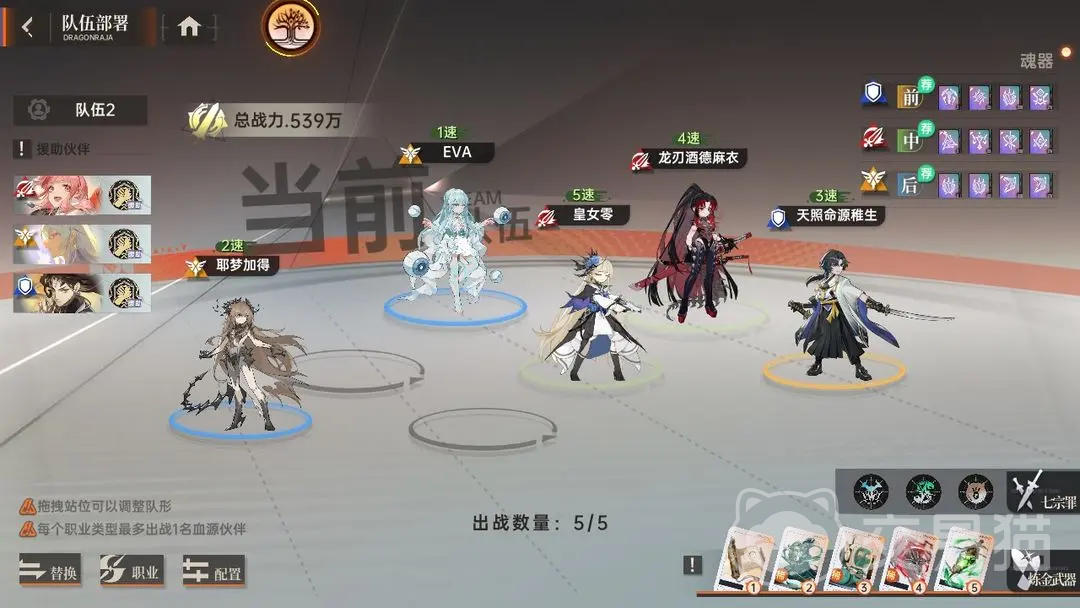 本配置以源稚生为绝对前排支点,依托其多重减伤、控场与领域增益,构建高容错率战斗环境。零与酒德麻衣居中排,分别承担爆发斩杀与持续压制职能;耶梦加得与EVA位于后排,提供治疗、能量支援与状态净化等复合辅助能力,确保队伍全程维持高生存与高输出节奏。该组合在PVE推图与高难副本中表现稳健,攻防转换流畅,资源循环压力低。