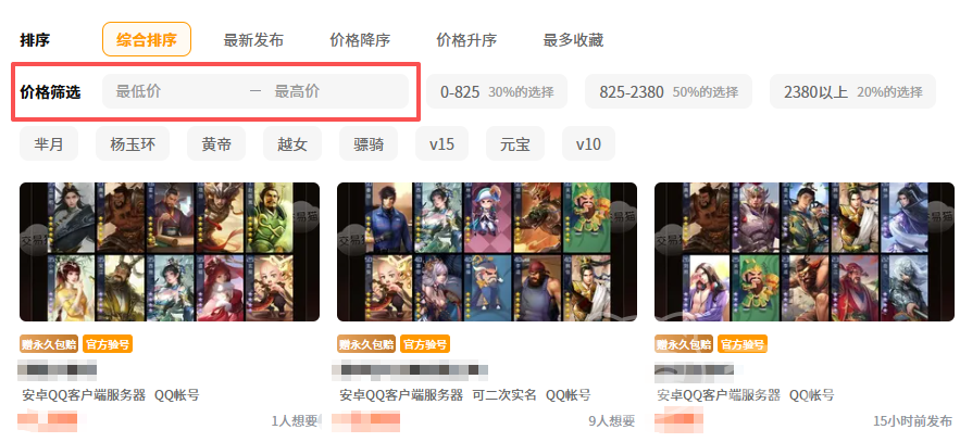 如果是买家,那么在平台内可以进行选择的账号还是比较多的,小伙伴们不仅可以根据个人所想要的资源进行检索,也可以根据自己当前手里可使用的资金状况来,直接选出自己可购买的对象,这样检索之后,大家只需要考虑账号是否是自己喜欢的,不必考虑价格问题,减少了去查看其他不符合个人要求账号的时间。