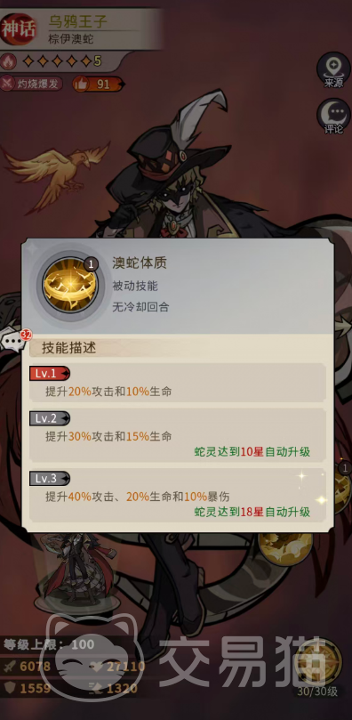 被动「澳蛇体质」提供关键属性成长:初始提升20%攻击与10%生命;技能升级后为30%攻击与15%生命;满级(3级)时直接提供40%攻击、20%生命及10%暴击伤害加成。这一暴伤增幅,配合其他被动协同,使其在神话品质角色中稳居爆发输出梯队首位。