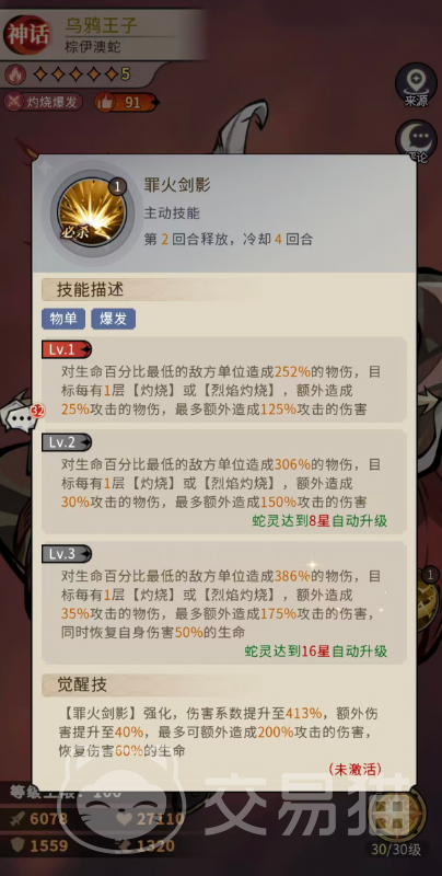 必杀技「罪火剑影」专注单体斩杀:首次释放可对敌方生命百分比最低单位造成252%物理伤害;目标每携带1层灼烧或烈焰灼烧,额外附加25%攻击力的伤害,最高可叠加5层,即额外+125%攻击力。当乌鸦王子升至16星时,基础伤害提升至386%,单层灼烧增伤提升至35%,上限达+175%攻击力;同时恢复自身本次伤害50%的生命值。完成技能强化后,基础伤害达413%,单层增伤提升至40%,上限突破至+200%攻击力,并将生命恢复比例提升至60%。