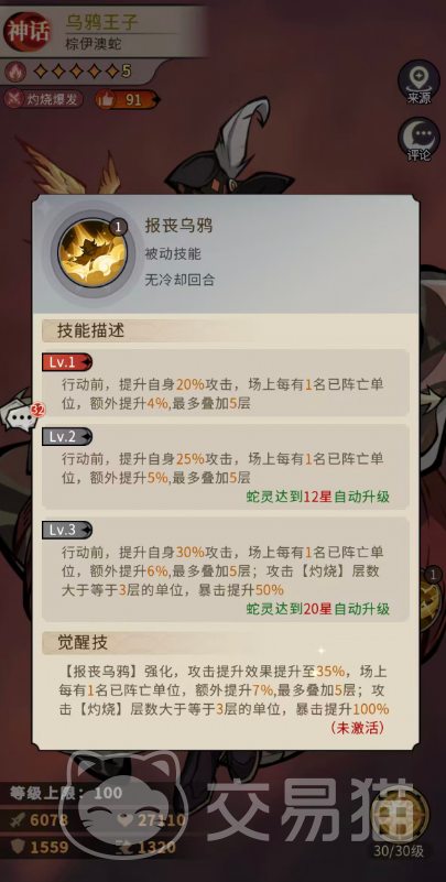 另一被动「报丧乌鸦」赋予动态增益机制:行动前有概率触发,成功后立即提升20%攻击力;后续每有1名己方单位阵亡,额外提升4%攻击力,最多叠加5层(即总计+40%)。觉醒后,基础增益提升至35%,阵亡单位增益提高至7%每层(上限仍为5层),且当攻击目标身上的灼烧层数≥3时,额外激活100%暴击率加成——极大强化了其在灼烧成型后的收割效率。