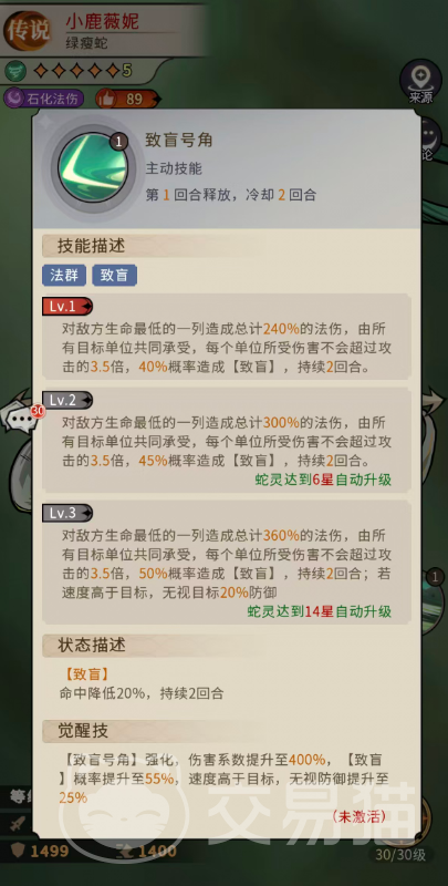 其一技能“致盲号角”为可主动释放的范围法术,初始等级下对敌方生命值最低的一列单位造成总计240%的法术伤害,并有40%概率施加持续2回合的致盲效果——使目标命中率降低20%。技能升至3级后,总伤害提升至360%,致盲概率同步增至50%;完成觉醒后,伤害进一步强化至400%,致盲概率达55%。值得注意的是:该伤害由目标列内所有单位共同分摊,单体承伤上限为小鹿薇妮攻击力的3.5倍;若其速度高于任一受击目标,则本次攻击可无视目标20%防御,觉醒后该无视防御比例提升至25%。