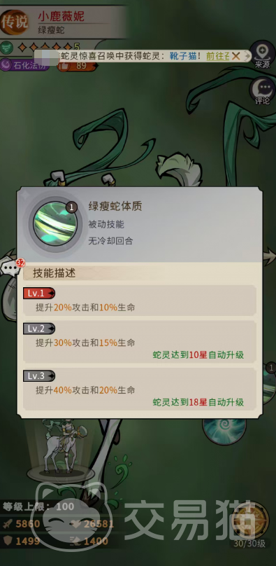 被动“绿瘦蛇体质”随星级成长提供稳定增益:初始提供20%攻击与10%生命加成;当小鹿薇妮升至18星时,自动强化为40%攻击与20%生命提升,是前期战力跃升的关键支撑。