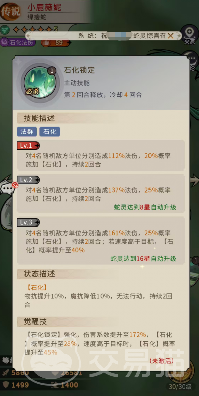 二技能“石化锁定”为必杀技,主动释放后随机选取4名敌方单位,分别造成112%法术伤害,并有20%概率附加石化状态。石化将使目标物抗+10%、魔抗-10%,且完全封锁其下回合行动。该效果与后续魔法输出角色高度契合,不建议搭配物理系主力。技能升至3级时,若小鹿薇妮速度高于目标,石化触发率提升至40%;觉醒后,单次伤害提升至172%,基础石化概率升至28%,速度优势状态下最高可达45%。