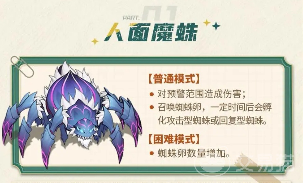 首位登场的是人面魔蛛。在普通难度下,该Boss会释放扇形预警区域造成范围伤害,并周期性生成蜘蛛卵;孵化后将分别形成攻击型或治疗型蜘蛛。困难模式中,蜘蛛卵生成数量显著提升。应对要点在于:精准预判预警范围规避直伤,同时优先集火未孵化的蜘蛛卵,阻断功能性单位入场。