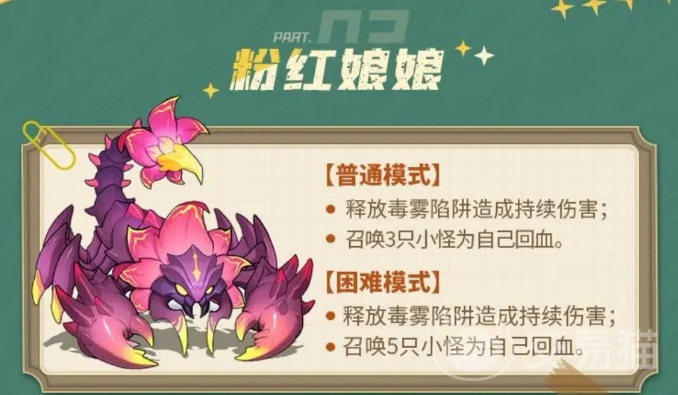 第三位为粉红娘娘。普通难度中,她施放持续毒雾陷阱并对范围内目标施加DOT效果,同时召唤3只辅助小怪为其恢复生命值;困难模式下,小怪数量增至5只。破局关键在于:在毒雾生效间隙快速移动至安全区,并同步清理所有小怪,彻底切断其续航能力。