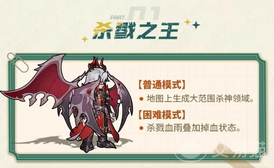 杀戮之王居于第五位。普通难度下,其展开大范围“杀神领域”,对区域内角色持续扣血;困难模式在此基础上叠加“杀戮血雨”Debuff,进一步加剧持续掉血速率。最优解法为:始终维持在领域外侧安全区进行远程压制,困难模式建议编队中配置具备稳定治疗能力的职业角色,以抵消叠加减益效果。